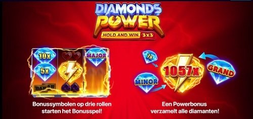 Het Power Bonussymbool kan zowel tijdens het reguliere spel als het bonusspel op de rollen landen. Dat is prettig, want de Power Bonussymbool activeert de Diamant Power functie. Alle winstgevende diamanten worden uitgekeerd aan de speler. De speler kan één van de jackpotprijzen winnen op deze manier. Het gaat om de Mini, Minor, Major of zelfs de Grand Jackpot op de Diamonds Power: Hold and Win gokkast!