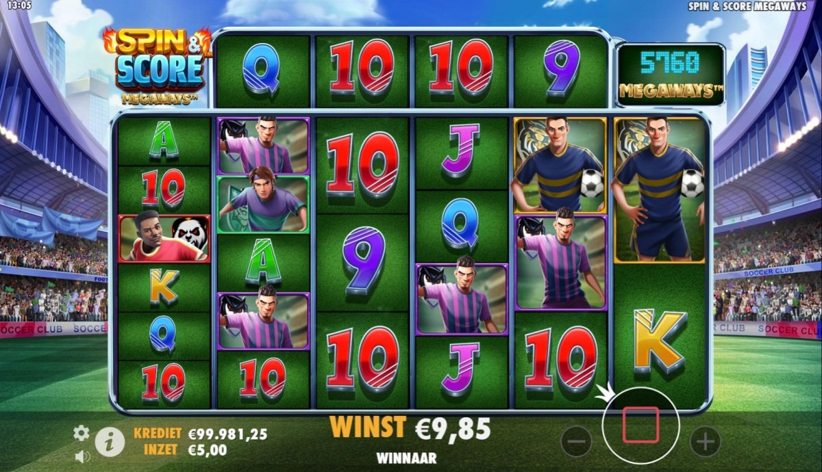 De Spin & Score Megaways gokkast, ontwikkeld door Pragmatic Play, brengt de spanning van het voetbalveld naar ons Casino! Dit populaire spel, gelanceerd rond het WK-voetbal 2022, blijft een favoriet onder casinospelers. Met zijn dynamische Megaways-mechanisme en herkenbare voetbalsymbolen biedt deze gokkast volop actie en kansen op mooie prijzen.